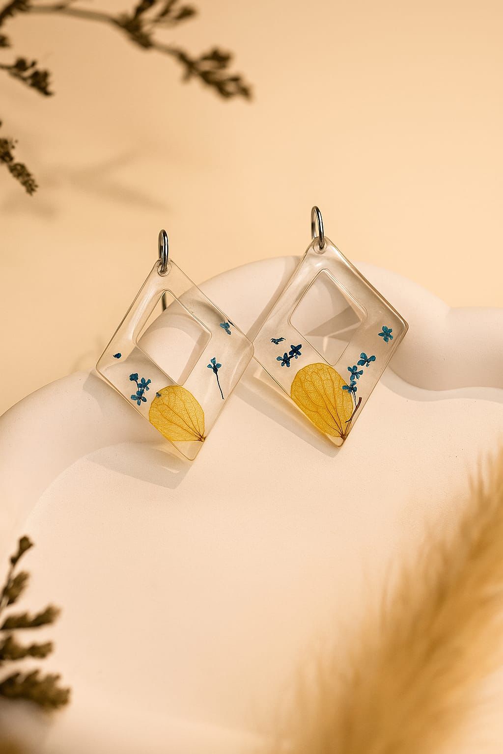The Resin Bloom Drop earrings are a celebration of floral elegance, crafted with precision from UV resin. Their delicate petal-inspired design shines with a glossy, glass-like finish that reflects light beautifully. Lightweight yet durable, they add a fresh and graceful touch to any outfit, making them perfect for both everyday charm and special occasions.
